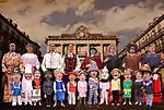 Los catorce cabezudos representan a las diferentes fiestas que hay en el calendario de la ciudad. Así, hay tamborrero, cantinera, cocinero y aguadora en representación de la Tamborrada; una pareja de caldereros; Iñude y Artzaia; Arlequín y Pierrot con su Carnaval; dos cabezudos de la Belle Époque de la Semana Grande y por último una pareja de caseros de Santo Tomás.
