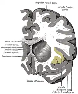 ![]() Vista lateral izquierda del encéfalo. Se ha retirado la parte inferior de los lóbulos frontal lateral y parietal. 1: Circunvoluciones cortas de la ínsula. 2: Surco central de la ínsula. 3: Circunvolución larga de la ínsula. 4: Circunvoluciones temporales transversas. | ||