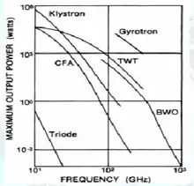 Los amplificadores basados en TWT pueden llegar a proporcionar picos de salida con una potencia de 30 MW con un haz de voltaje del orden de 100 kV a una frecuencia de 10 GHz.