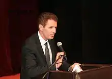 ![]() Gjekë Marinaj contestando preguntas en el festival de poesía de Gjakove, Kosovo, 2011 | ||
