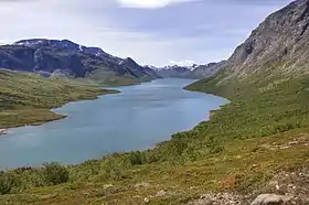 Gjende (o Gjendin ) es un lago en las montañas Jotunheimen en el parque nacional Jotunheimen de Noruega .[1] El lago proglacial muestra características típicas de formación glaciar, siendo largo y estrecho, con paredes escarpadas — 18 km de longitud y solo 1,5 km de ancho en el punto más ancho. Gjende tiene un característico color verde claro que se debe a la gran cantidad de harina de roca que vierte el río Muru en el Gjende. El río Sjoa proporciona la salida de Gjende en Gjendesheim, y desemboca hacia el este en el río Gudbrandsdalslågen.
