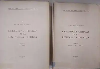 - Cabrera Bonet, Paloma; Olmos, Ricardo (2017). «Cerámicas griegas de la Península Ibérica, un hito en la historia de la arqueología española». Homenaje a Glòria Trias Rubiés: cerámicas griegas de la Península Ibérica: cincuenta años después (1967-2017) = Homenatge a Glòria Trias Rubiés : cerámicas griegas de la Península Ibérica: cinquanta anys després (1967-2017), 2017, ISBN 978-84-393-9615-4, págs. 31-43 (Centro Iberia Graeca): 31-43. ISBN 978-84-393-9615-4. Consultado el 29 de septiembre de 2020.