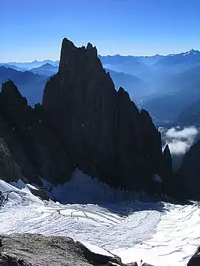 ![]() Vista del glacial, con la Aiguille Noire de Peuterey | ||