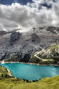 El glaciar queda por encima del lago Fedaia. Del glaciar nace el torrente Avisio.