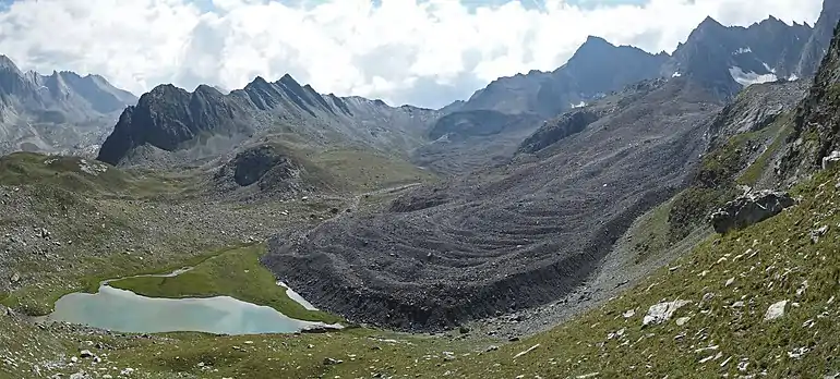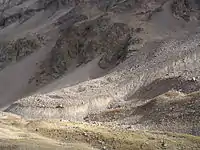 una masa de peñascos surtidos con hielo intersticial a más o menos un metro de profundidad (cementado por hielo) o que contiene hielo de glaciar enterrado (núcleo de hielo). Ocurren en altas montañas en áreas de permafrost y deriva de la pared de un circo u otro acantilado.Lionel Jackson[2]