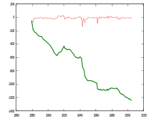 En verde grueso: diferencia de longitud acumulada comenzando en 1879