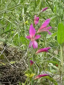 Probablemente es nativo de gran parte de Eurasia, pero es bien conocido en otros continentes en los que es una maleza común, especialmente de los campos de cultivo y lugares de residuos. Esta flor perenne crece en un tallo erecto que alcanza un metro de altura máximo con algunas largas hojas alrededor de su base. Hacia la mitad superior del tallo, generalmente sin ramificar, tiene un pico de inflorescencia en la que aparecen las flores en los intervalos. Cada planta tiene un máximo de 15 o 16 flores. La flor es de color rosa brillante a magenta y de varios centímetros de largo, con sus estambres y el estilo que sobresalen de la garganta. El fruto es una cápsula que contiene muchas semillas de alrededor de un centímetro de largo.