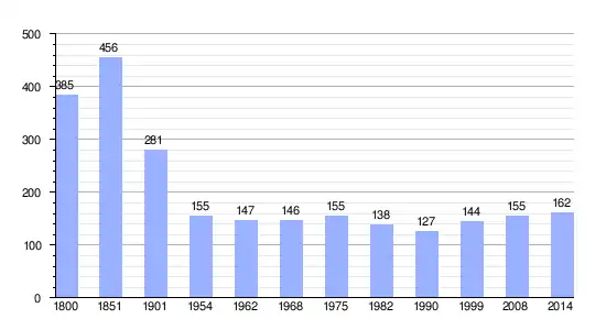 Los datos demográficos contemplados en este gráfico de la comuna de Glatigny[4] se han cogido de 1800 a 1999 de la página francesa EHESS/Cassini, y los demás datos de la página del INSEE.[5]