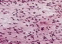 El tejido de origen es glial, principalmente astrocitario, pero también se han descrito con componente oligodendroglial o mixtos.[11] Histológicamente, suele encontrarse una proliferación amplia y difusa de células gliales tumorales, núcleos generalmente alargados con bajo pleomorfismo, morfología astrocitaria, actividad mitótica variable y no suele haber proliferación vascular. La infiltración de los elementos gliales en la sustancia blanca destruye las vainas de mielina pero preserva relativamente las neuronas y los axones.[12]