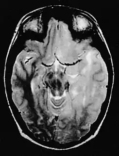 ![]() La imagen de RM ponderada en T2 muestra (en el lado derecho) la infiltración difusa del tumor. | ||