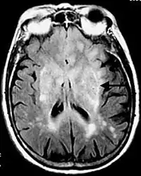 Es típica la afectación de los dos hemisferios cerebrales. También puede afectar al tronco cerebral, el cerebelo y la médula espinal.