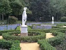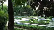 Cada uno de los parterres lo forman setos de bonetero (Euonymus japonicus) y en su interior hay plantas de flor. También destacan dos árboles de Júpiter (lagerstroemia indica) y a sus bordes palmeras de la fortuna (trachycarpus fortunei).