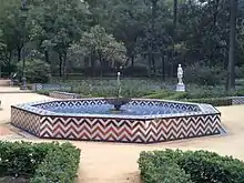 Son destacables la combinación de colores blanco, azul y cobrizo de los azulejos de la fuente, bancos y muretes del entorno. En los parterres laterales se exponen cuatro esculturas que representan las cuatro estaciones del año.