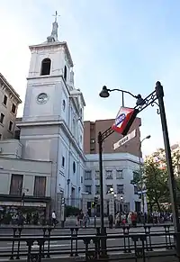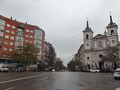 En su origen se llamaba plaza de la Iglesia, por la iglesia de Santa Teresa y Santa Isabel, cuya construcción a cargo del arquitecto José María Aguilar y Vela se inició el 22 de octubre de 1842,[4] y no se concluiría hasta 1856.[lower-alpha 1][5] El templo fue destruido en 1936 y reconstruido entre 1942 y 1950 por otro similar, de estilo neoclásico, obra de José María Garma Zubizarreta.[6] Cuenta el cronista Pedro de Répide que el templo fue originalmente dedicado a la Concepción, como anexo a la parroquia de San José. Tuvo en sus altares pinturas de Luis Taberner y la popular imagen de la Virgen de Buenavista (o de los Castellanos),[7] que lleva en su mano el pendón morado, cedida por el erudito Basilio Sebastián Castellanos mediado el siglo xix.[8][lower-alpha 2][9] Otra anécdota recogida por Répide relata que, durante el dilatado proceso se construcción de la iglesia, el cura Merino (activista liberal, condenado por su atentado fallido contra la reina Isabel II en 1852), al pasar ante el edificio camino del patíbulo situado en el Campo de Guardias, «dijo con gran serenidad al contemplarle: "Efectivamente, está desnivelado".»[8]