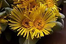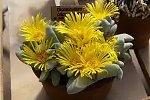 Es una pequeña planta suculenta perennifolia de pequeño tamaño que alcanza los 4 cm de altura. Las plantas tienen hojas gruesas y suaves, dispuestas en pares, postradas o rastreras. Cada hoja está cubierta con una capa cerosa blanca que se puede frotar. La hoja es gruesa con márgenes suavemente redondeados. Los tallos se ramifican hasta que la planta forma un grupo. Tienen rizomas. Las flores son amarillas con pétalos estrechos, a veces perfumadas, de hasta 5 cm de diámetro. Los frutos sin tallo tienen bases cónicas suaves y se caen de la planta cuando se secan, convirtiéndose en frutos caídos y esparciendo las semillas. Los frutos tienen valvas altas y sin aristas con un máximo de ocho lóculos.