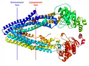 Estructura cristalográfica de la proteína MDR3 de ratón. La disposición aproximada de la proteína en la membrana de la célula está indicada por la línea azul (cara extracelular) y por la línea roja (cara citoplasmática).[1]