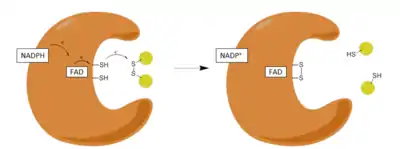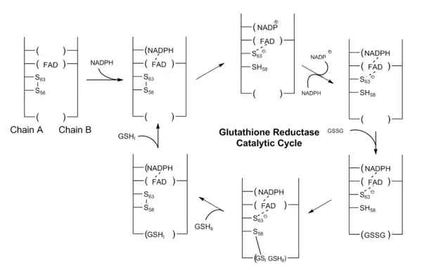 , el cual toma un protón desde el solvente y se libera de la enzima en forma de una segunda molécula de GSH. De esta forma por cada molécula de GSSG y NADPH, se liberan dos moléculas de GSH, las cuales pueden actuar como sumideros antioxidantes para las especies reactivas de oxígeno dentro de la célula.[9]