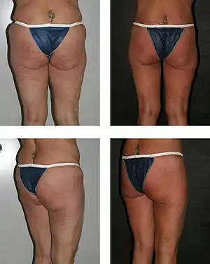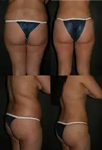 La cirugía de glúteos y lipoescultura del cuerpo humano presenta posibles complicaciones médicas tales como: las psicológicas - insatisfechas las expectativas de imagen corporal de mejora estética; la física - contorno irregular, local y general; el fisiológica - reacciones tóxicas a la anestesia y los medicamentos tumescente; y los nerviosos - parestesia, áreas localizadas de perdurable entumecimiento en la parte corregida (s) de la región glútea.[4] Las posibles complicaciones médicas a un procedimiento de aumento de glúteos quirúrgico, el emplazamiento submuscular de un implante glúteo, incluyen la infección, dehiscencia de la herida quirúrgica que expone el implante, la cirugía de revisión, la rotura del implante, seroma (un bolsillo de líquido seroso claro), contractura capsular, la asimetría de la zona corregida, cambiado del implante, cirugía de exceso de corrección, lesión en el nervio ciático, y parestesia (hormigueo de la piel). Las posibles complicaciones médicas a un aumento de las nalgas y/o lipoescultura incluyen la resorción corporal de la parte de la grasa inyectada, contorno asimétrico de la zona del cuerpo corregido, un contorno irregular al cuerpo, seroma, absceso (pus rodeada por tejido inflamado), celulitis (subcutánea inflamación del tejido conectivo), y parestesia.[4]