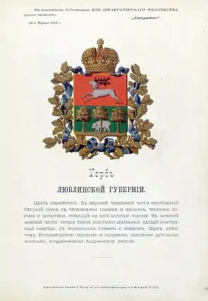 El escudo de armas de la provincia de Kholm fue aprobado supremamente el 15 de octubre 1914 y tenía la siguiente descripción: "En un escudo verde con una cabeza, entre tres árboles dorados, un oso de plata caminando con ojos de cereza y lengua. En la cabeza dorada del escudo hay un águila imperial negra con tres coronas".