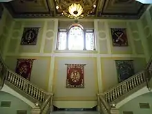 - El altar de la patria: es una mujer desnuda con un bloque de piedra a la espalda, que simboliza los altares sacrificiales romanos, del que sale una llama inscrita en un círculo. Representa pues el «altar de la patria» en el que se inmolan los que mueren para defenderla.[5]