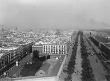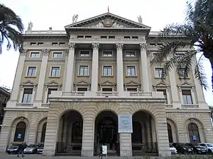 El proyecto arquitectónico fue del ingeniero militar José Sans Forcadas, que contó con la ayuda del ingeniero director Pompeyo Martí y la supervisión del arquitecto municipal Adolf Florensa. De estilo neoclásico, recuerda el teatro de La Scala de Milán y el edificio del Ministerio de Agricultura de Madrid,[5] aunque su inspiración directa provino del palacio de la Lonja de Barcelona, también neoclásico y situado al otro extremo del paseo de Colón.[6] Su construcción se prolongó hasta 1932. Inicialmente acogió las dependencias del gobernador militar, de los servicios jurídicos del Ejército (incluida una sala para consejos de guerra), el Patronato de Casas Militares y la Jefatura de Transportes.[5]