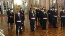 El 29 de julio de 2021, en la Pampa de la Quinua (Ayacucho), el presidente Castillo tomó juramento a Guido Bellido Ugarte como presidente del Consejo de Ministros.[25] Esa misma noche, en el Gran Teatro Nacional, juramentaron la mayoría de ministros a excepción de los del Ministerio de Economía y Finanzas y Justicia y Derechos Humanos que juramentaron al día siguiente.[26] La designación de Bellido causó controversia debido a que es investigado por la Fiscalía por el presunto delito de apología al terrorismo.[27] Así mismo, la minoritaria participación de solo dos mujeres en el gabinete, algo que no ocurría desde el año 2006, «es una muestra del conservadurismo de Perú Libre» según la politóloga peruana Paula Távara.[28]