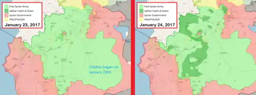 - After 9 days of bloody clashes, Hayyaat Tahrir al-Sham with the “jihadi” factions control about 80% of the area of what is left for the opposition factions within Syrian territory. Publicado el 9 de enero de 2019. Consultado el 14 de enero de 2019.