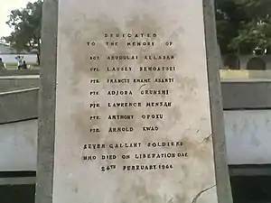 ![]() Tabla conmemorativa con los nombres de los siete muertos durante las manifestaciones anti-Nkrumah el día del golpe. | ||||