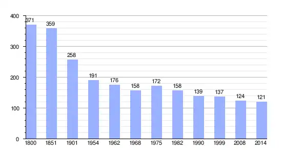Los datos demográficos contemplados en este gráfico de la comuna de Gouberville[4] se han cogido de 1800 a 1999 de la página francesa EHESS/Cassini, y los demás datos de la página del INSEE.[5]
