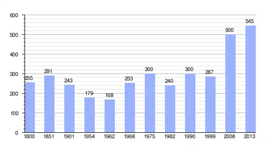 Los datos demográficos contemplados en este gráfico de la comuna de Gouville[4] se han cogido de 1800 a 1999 de la página francesa EHESS/Cassini, y los demás datos de la página del INSEE.[5]