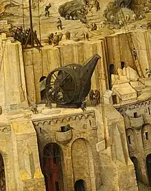 Para pesos mayores de hasta 100 toneladas, los ingenieros romanos armaban una torre de elevación de madera, un caballete rectangular que era construido de manera tal que la columna podía ser levantada en posición vertical en el centro de la estructura por medio de cabrestantes accionados mediante tracción humana y animal, que se colocaban en el suelo alrededor de la torre.[2]