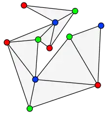 Todos los grafos planos exteriores sin bucles pueden ser coloreados usando solo tres colores.[7] Este hecho ocupa un lugar destacado en la demostración simplificada por hallada por Fisk (1978) del problema de la galería de arte planteado por Václav Chvátal. Se puede encontrar un 3-coloreado en tiempo lineal mediante un algoritmo de coloreado ávido que elimina cualquier vértice de grado como máximo dos, colorea el grafo restante de forma recursiva y luego vuelve a agregar el vértice eliminado con un color diferente de los colores de sus dos vecinos.
