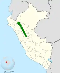 Se distribuye por la pendiente oriental de los Andes de Perú, desde Amazonas y San Martín al sur y este del río Marañón, hacia el sur hasta Huánuco, al norte del río Huallaga, en altitudes entre 2400 y 3900 m.[1]