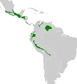 Se distribuye desde el sur de México, por Guatemala, El Salvador, Honduras, Costa Rica, Nicaragua, Panamá, Colombia, hacia el este hasta el noroeste de Venezuela y Trinidad y hacia el sur a lo largo de los Andes de Colombia, Ecuador, hasta el sur de Perú y centro de Bolivia, con una población en los tepuyes del sur de Venezuela, y adyacencias del oeste de Guyana y norte de Brasil.[5]