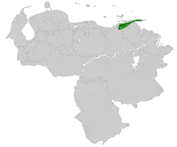 Se distribuye en las montañas costeras del norte (Estado Anzoátegui, Sucre y Monagas y noreste (Península de Paria) de Venezuela.[3]