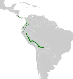 Habita en el sotobosque de bosques montanos húmedos de Bolivia, Colombia, Costa Rica, Ecuador, Panamá y Perú, principalmente en los Andes, entre 800 y 2200 msnm de altitud.[1][4]