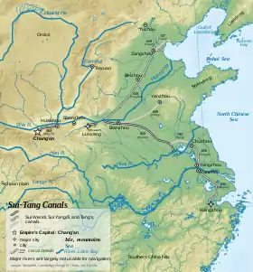 El Gran Canal, como se ve ahora, fue en gran parte una creación de la dinastía Sui (581-618), como resultado de la migración de la región del núcleo económico y agrícola de China hacia el valle del río Amarillo y lo que ahora son las provincias de Jiangsu y Zhejiang. Su principal papel a lo largo de su historia fue el transporte de grano a la capital. Sin embargo, la institución del Gran Canal por los Sui también evitó la necesidad de que el ejército, mientras estaba en la frontera norte, tuviese que ser autosuficiente a cuenta de los agricultores, ya que los suministros de alimentos podrían ser entonces fácilmente enviados por el canal desde el sur al norte.[7]