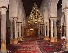 La sala de oración, que es accesible a través de diecisiete puertas de madera tallada, está dividida en diecisiete naves y ocho tramos incluyendo más de cuatrocientas columnas antiguas de mármol blanco, pórfido rojo y de granito azul similares a las columnas de las galerías que bordean el patio. El minbar, que data del siglo IX, es conocido como el más antiguo del mundo islámico[13] y está compuesto de cerca trescientas piezas de teca cuidadosamente labradas y ensambladas. A la derecha del minbar se encuentra la maqsura, que es un espacio rodeado de un hermoso muro de madera finamente adornado con diversos motivos geométricos, donde el soberano asiste a la oración. El mihrab, que marca la dirección de La Meca, es revestido de mármol tallado en veintiocho paneles condecorados con una gran variedad de motivos geométricos y vegetales.[14] El alfiz rectangular que enmarca el mihrab es adornado con azulejos de cerámica de reflejo metálico polícromos y monocromos; todas las piezas tienen 21 cm de lado y 1 cm de espesor. De acuerdo a varios historiadores, la preciosa colección de cerámicas del mihrab de Kairuán es originaria de Mesopotamia, posiblemente de Bagdad.[15] La decoración del mihrab actual data probablemente como lo señala el geógrafo e historiador hispanoárabe al-Bakri, de la época de Ziyadat Allah (817-838). Por su elegancia, la decoración del mihrab es considerada como una de las composiciones más armoniosas del arte islámico.