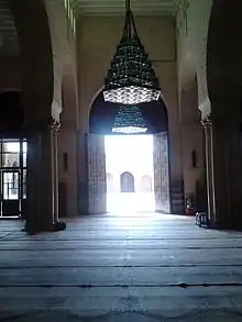 La gran sala hipóstila, salpicada de columnas corintias, consta de nueve pasillos perpendiculares a la qibla y cuatro bahías. La nave central, mucho más alta y ancha que las demás, está flanqueada por una hilera de gruesos arcos gemelos, sostenidos por grupos de cuatro columnas en lugar de las columnas gemelas utilizadas en las naves. La nave central define así un eje dentro de la estructura hipóstila que conduce al mihrab. La intersección con el transepto, de igual magnitud y paralelo al muro de la qibla, da como resultado una planta en forma de T, un rasgo arquitectónico cuyo punto central es la intersección del transepto y la nave frente al nicho del mihrab.