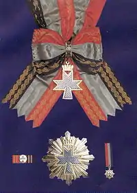 ![]() Gran Orden de la Reina Jelena (arriba: medalla de la Gran Orden con la faja; inferior: medalla de la Estrella de la Mañana (Danica); izquierda: la versión más pequeña decorativa; derecha: cinta de la Gran Orden) | ||