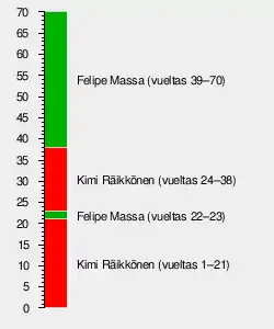 En la vuelta veinte, Trulli y Kubica realizaron sus pit stops.[37] Räikkönen y Massa también pasaron por sus garajes en las dos vueltas siguientes.[37] Para la trigésima vuelta, Räikkönen había abierto una brecha de 6,6 segundos sobre Massa, mientras Trulli se mantenía en la tercera posición, a medio minuto del piloto brasileño.[37] Justo antes de alcanzar el ecuador de la carrera, el ritmo de Räikkönen bajó y Massa consiguió adelantarle en la vuelta 39.[37] Tras el paso por línea de meta, el finlandés explicó que su falta de ritmo se había debido a la rotura de su tubo de escape derecho, lo que había propiciado una pérdida de potencia por parte del motor del vehículo.[38] Mientras tanto, Kovalainen, que rodaba en el séptimo puesto, pasó a Webber y se colocó sexto.[37]