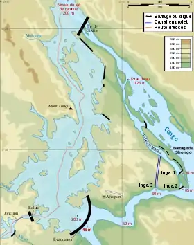 Un embalse, el embalse de Shongo, ha permitido poner bajo agua el Nkokolo. El agua es captada a 10 kilómetros del embalse Inga II, a una altitud de 125 metros, para alcanzar 115 metros al nivel del bief que alimenta los embalses Inga I y Inga II. Un canal de una longitud de algunos centenares de metros, ubicado al oeste del embalse Inga I (45 metros de desnivel, 115-70 metros), alimenta el embalse Inga II (50 metros de desnivel, 115-65 metros). Un canal excavado aguas arriba de las otras dos presas permitiría que la presa Inga III se construyera debajo de las otras dos presas, beneficiándose así de una diferencia de elevación de 55 metros (115-60 metros). Los 3 embalses desarrollarían así una potencia total de 6 275 MW a potencia plena (Inga I e II funcionan actualmente a aproximadamente 20 % de su capacidad, y Inga III no existe todavía).[2]