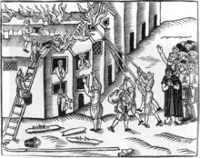 Se implementaron procedimientos comunitarios autosuficientes para hacer frente a los incendios y, por lo general, fueron efectivos. Ciudadanos de espíritu público serían alertados de un peligroso incendio en la casa por repiquetes de campanas de las iglesias y se congregarían apresuradamente para combatir el incendio.[22][23] Los métodos disponibles para ello se basaron en la demolición y el agua. Por ley, la torre de cada iglesia parroquial debía contener equipo para estos esfuerzos: escaleras largas, cubos de cuero, hachas y «ganchos de fuego» (firehooks) para derribar edificios.[lower-alpha 3][25][26] A veces, los edificios más altos se derruían rápida y efectivamente mediante explosiones controladas de pólvora. Este método drástico para crear cortafuegos se utilizó cada vez más hacia el final del gran incendio y los historiadores modernos creen que fue lo que finalmente venció el fuego.[27]