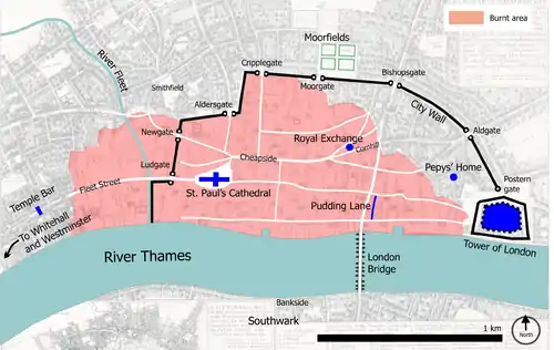 La ciudad era esencialmente medieval en su plano urbano: un laberinto abarrotado de callejones estrechos, sinuosos y empedrados. Había experimentado varios incendios importantes antes de 1666 (el más reciente en 1632). La construcción con madera y tejados de paja habían estado prohibida durante siglos, pero estos materiales baratos continuaron utilizándose.[13] La única área importante construida en piedra era el pudiente centro de la ciudad, donde las mansiones de los comerciantes y agentes de bolsa se emplazaban en espaciosos lotes, rodeados por un anillo interno de parroquias pobres y superpobladas en el que cada pulgada de espacio de construcción se usaba para acomodar el rápido crecimiento poblacional. En estas parroquias estaban los lugares de trabajo, muchos de los cuales eran factores de riesgo (fundiciones, herrerías, vidrierías), que eran técnicamente ilegales en la ciudad, pero tolerados en la práctica.[14]