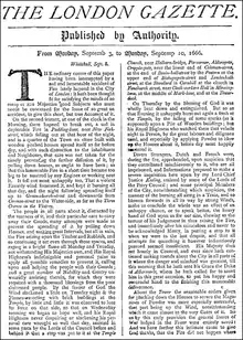 Facsímil de la portada de The London Gazette, del 3 al 10 de septiembre, con un relato del gran incendio.