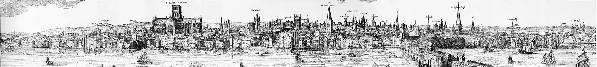 Vista panorámica de la City de Londres en 1616 por Claes Visscher. Las viviendas construidas en el puente de Londres (extremo derecho) eran una reconocida trampa mortal en caso de incendio; muchas fueron destruidas en un incendio en 1633.
