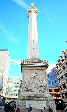 Por iniciativa de Carlos II, se erigió el monumento al gran incendio de Londres cerca de Pudding Lane, diseñado por Wren y Hooke, con una altura de 61 m y conocido simplemente como «el Monumento». Es un hito familiar de Londres que desde entonces ha dado su nombre a una estación de metro. En 1668, se agregaron acusaciones contra los católicos a la inscripción en el monumento:[102]