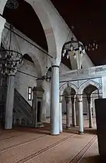 La entrada al patio de la mezquita se realiza a través de una puerta de mármol monumental en la fachada norte. El nártex con 14 columnas para soportar 16 cúpulas ha sido decorada con azulejos. El material de construcción del edificio principal es de piedra tallada. Las columnas en el edificio principal se han conectado con un arco de medio punto llamado Arco de Irán. El púlpito y el nicho (dirigido a La Meca) están hechos de mármol.[2]