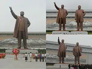 6. Vale, Paul (13 de abril de 2012). «North Korea Statues: Kim Jong-Un Attends Ceremony In Pyongyang For Unveiling Of Family Monuments». The Huffington Post UK. AOL (UK) Limited. Consultado el 6 de marzo de 2017. «North Korean leader Kim Jong-Un has attended a ceremony to unveil the country’s latest political monuments - a statue of his late father Kim Jong-il, which stands next to that of his grandfather, Kim il-Sung. The twin behemoths, created from bronze, form the centre-piece of the Mansudae Grand Monument in the capital, Pyongyang. »