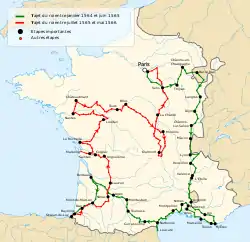 - Nantes (11 al 15 de octubre de 1565): El rey cruza el Loira por la mañana en la aldea de La Chebuette (en la actual comuna de Saint-Julien-de-Concelles), luego cena en Thouaré y llega a Nantes para dormir, después de haber atravesado los grandes prados de la ciudad. No fue hasta la tarde siguiente 12 de octubre, que ve pasar las compañías y hace su entrada solemne a la ciudad. Fue recibido en el Castillo de los duques de Bretaña por las autoridades de la ciudad. Pasó tres días en la ciudad durante los cuales se le presentó con bailes tradicionales bretones como el Trihori y el passepied.